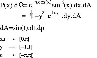 Spins with four components: S=(Sx,Sy,Sz,Sw) local field : hlocal=(hlocalx,hlocaly,hlocalz,hlocalw) Energy=-S.hlocal=-hlocal.cos(x) P(x)=e-Energy/T.sin2(x).sin(t).dx.dt.du =eh.cos(x).sin2(x).sin(t).dx.dt.du  |
